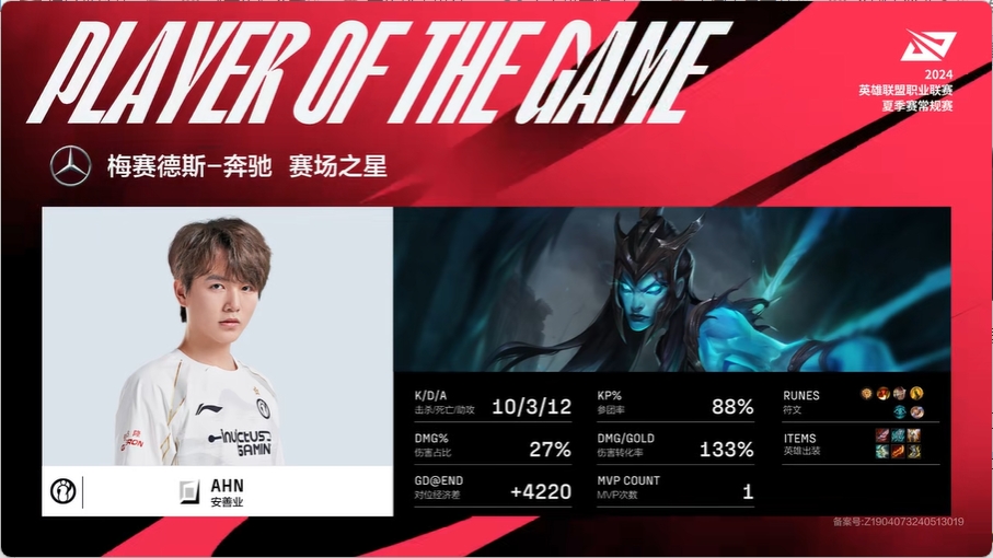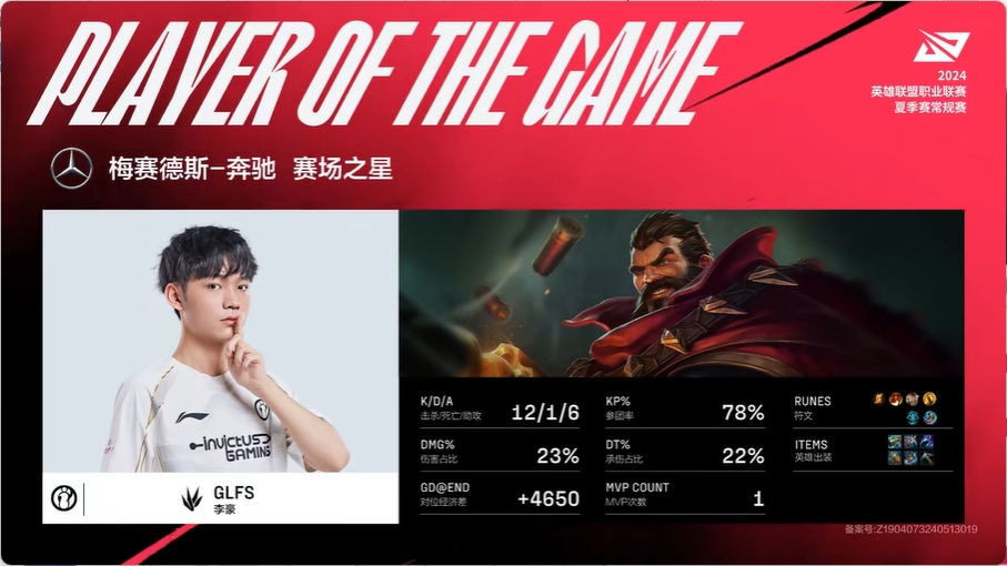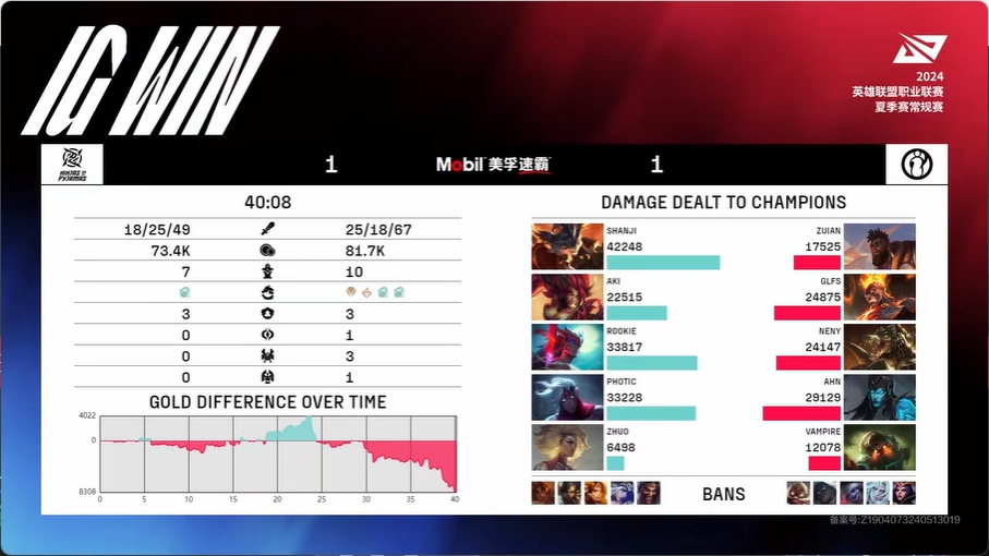 At 32 minutes, a teamfight broke out over the Baron. IG took the Baron first and gained a huge advantage, successfully trading 1 for 4 and ending the game with a mid lane push.