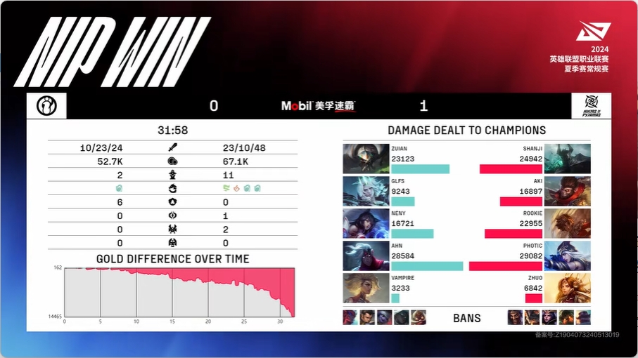At 39 minutes, IG pushed onto NIP's Nexus. Despite NIP's perfect skill combination, the difference in power was too great. IG killed multiple players and ended the game in one fell swoop.