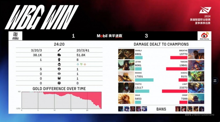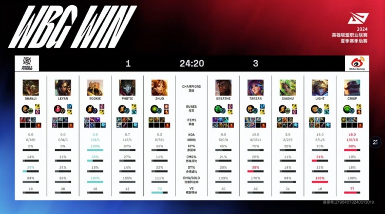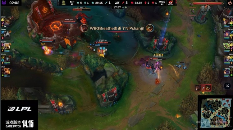 In the mid-game dragon fight, NIP had no chance in the frontal fight, Shanji's Renekton was solo killed by Breathe's K'Sante, WBG had a 1 for 4 trade, leading by 6k gold. In the late game, WBG crushed NIP in the jungle with a 3 for 0 trade, Light secured a triple kill, WBG secured the Baron, leading by 10k gold.