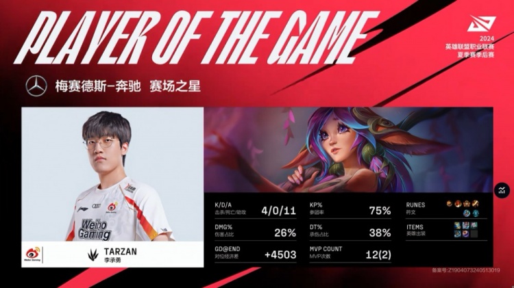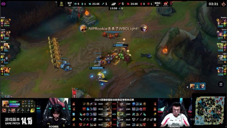 In the mid-game jungle fight, Leyan quickly killed Tarzan, but Rookie's Tristana ult pushed Light away to help him escape. Xiaohu's Zeri entered the fight and secured a double kill, leading WBG to a 1-for-5 team wipe against NIP, gaining a 5k gold lead.
