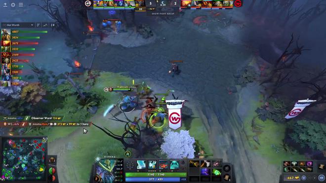 對線期結束,雙方經過幾分鐘的發育期后,nouns在15分鐘抱團推掉WG中路一塔,WG眾人姍姍來遲雖然留下兩人,但隨后太過戀戰殺入了nouns主野區人員太過分散,導致發條和獸被nouns反殺。18分鐘nouns入侵天輝下路野區抓到獸又一次將其擊殺,獸的經濟也因為兩度陣亡瞬間來到全場第六。22分鐘,美杜莎和狼人裝備初步成型選擇控盾,nouns想要接團但此時WG三核戰斗力更強將nouns打出三核陣亡并順勢為美杜莎控盾。中期,nouns通過先知的帶線拉扯能力讓WG在帶盾期間無法打出推進節奏。中期WG拿下二代盾后又一次被先知拖住。40分鐘WG選擇強攻中路高地,但nouns反手不斷消耗打殘了美杜莎再一擁而上將其擊殺,獸也被留下陣亡,nouns順勢反推一路。44分鐘WG再次選擇控盾,但小小關鍵時刻跳刀進場成功搶盾導致WG團戰潰敗,nouns順勢推進高地再破一路。55分鐘,nouns又一次控盾后發起總攻,小小大樹完美先手瞬間擊殺WG四人,美杜莎獨木難支最終倒地,WG大勢已去敲出GG,nouns先下一城。