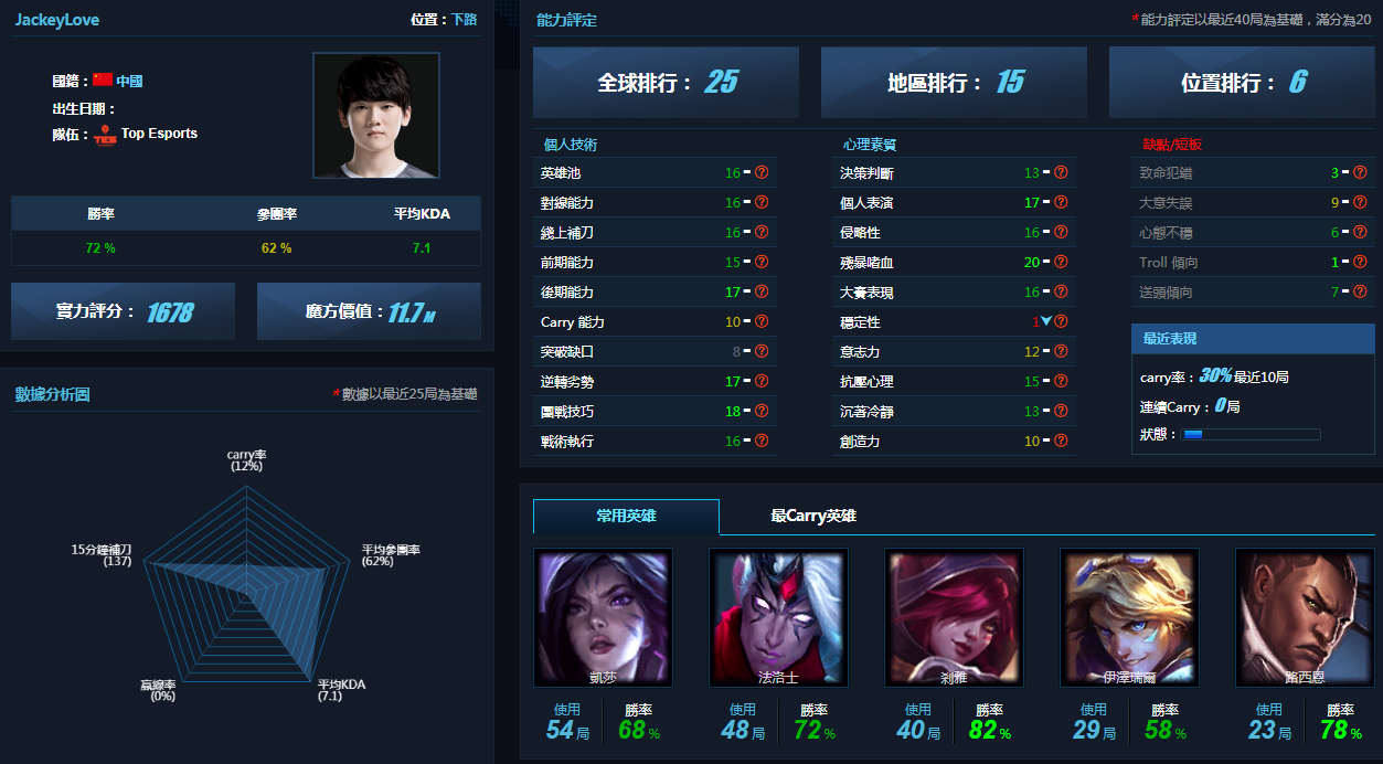 Jackeylove目前與TES戰隊簽約,在休賽期中網路上有他與RNG戰隊簽訂意向書的消息,但最終未能成功簽約。