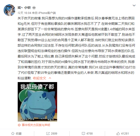 關於昨天的微博.我只是想為我的nt操作道歉承擔責任.阿水春季賽無法上場的原因和ig無關.但對於有些黑粉拿換隊的事抹黑阿水我忍不了了.在轉會期第二天我們和某俱樂部簽下了一份非常籠統的意向書.簽意向那天是我nt淩晨3,4點喊的阿水來簽字.過了兩天簽主合同的時候阿水發現條款太離譜後他就被嚇到不敢簽了.別說他不敢簽了我覺得tm這麼扯淡的合同是個正常人都不敢簽.當時我們就立刻告知該俱樂部這樣的合同我們沒法簽.不存在任何耽誤任何隊伍的說法.從頭到尾我們沒有任何違反聯盟規定和法律規定的違約操作.但因為這份意向書導致了阿水很難簽約隊伍.最後阿水為了能上場比賽.自己承擔損失解決了這個問題.然後才繼續找隊最後完成了和滔搏的簽約.對於因為我的nt操作讓阿水簽下的意向書給阿水帶來的損失.我感到非常愧疚自責才發的昨天的言論.真的非常抱歉.我們nt.經過這件事情我們也付出了代價吸取了教訓專業的事情還是要找專業的人來做.再次真誠的給阿水和阿水的粉絲道歉.