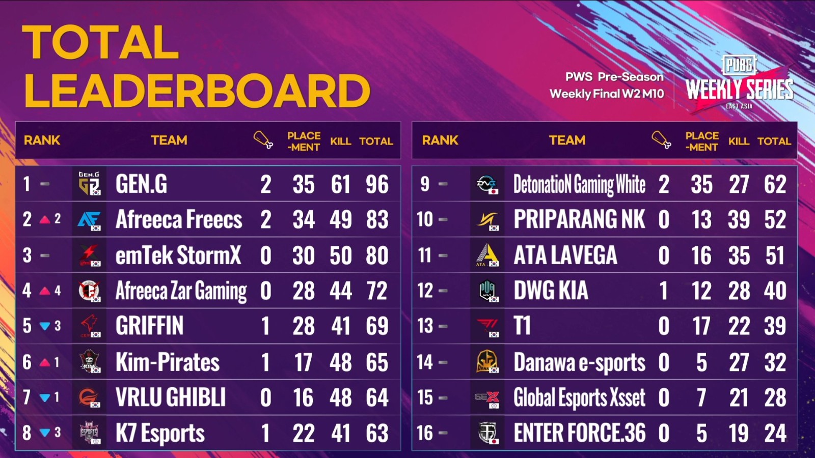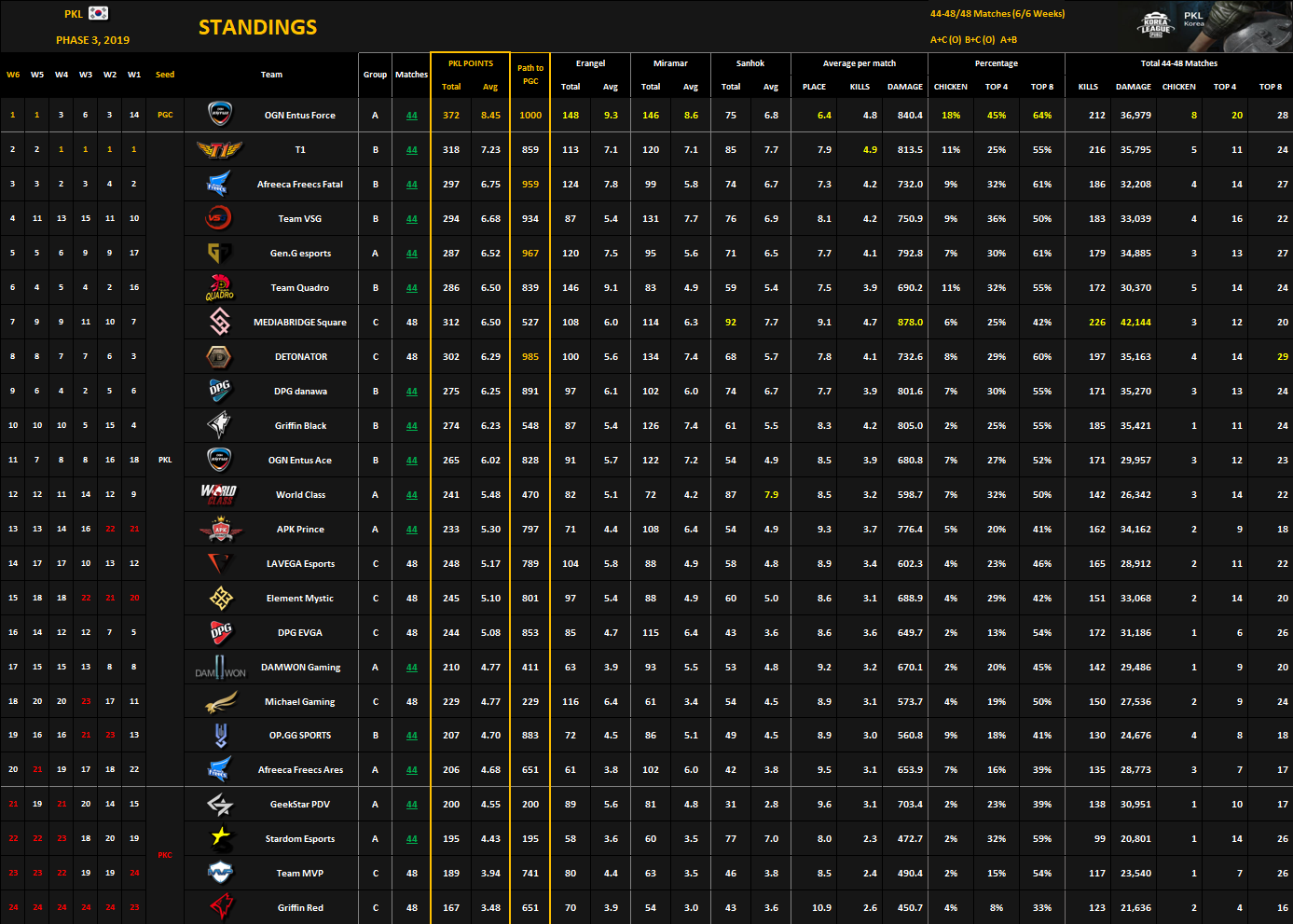 OGN Entus Force在艾倫格和米拉瑪地圖中展現了自己的絕對統治力,場均排名6.4的他們提前鎖定了一張PGC門票。