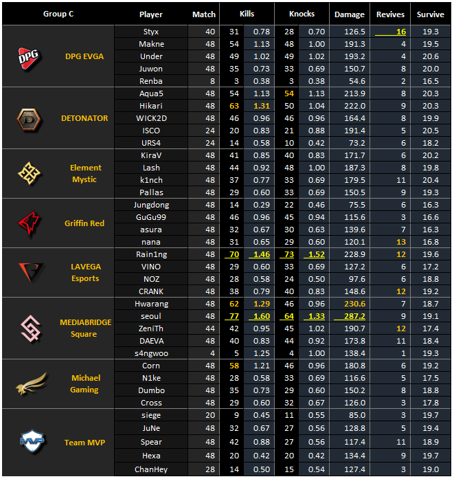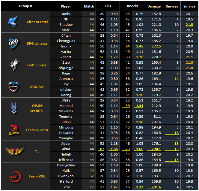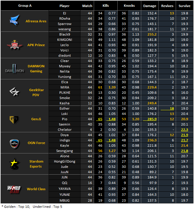 選手數據方面:A組 indigo 、seongjang、Pio這些耳熟能詳的名字在本賽季發揮依然出色,Pio以場均1.48擊殺,285.9點傷害位列A組所有選手之首。