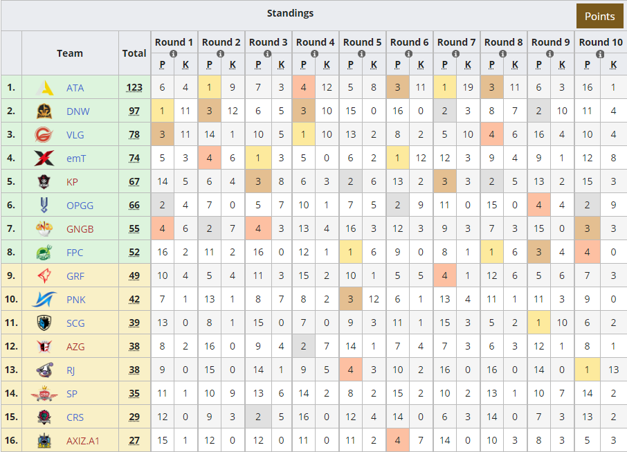 PWS第1周常規賽已經打完,ATA以123分強勢登頂,DNW與VLG分別奪得第2名和第3名,第1周常規賽前8名獲得周決的名額與直邀的8支隊伍進行決戰。